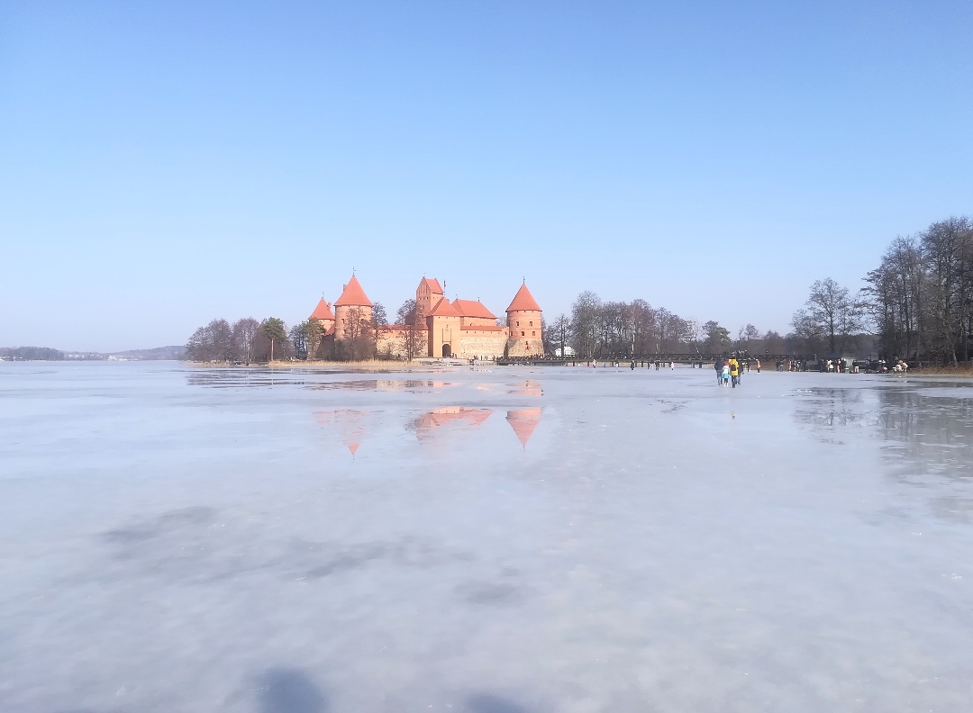 Trakai est une petite ville de Lituanie. Elle se situe à 30 mins de voiture de Vilnius. Initialement, nous avions juste prévu de visiter le château qui est assez sympa. Puis, c'est parti en cacahuète quand on a vu que les gens traversaient le lac gelé à pieds ! Au début, tu mets un pied, puis l'autre et après, te voilà en train de crapahuter sur la glace ! Le paysage est sublime et si blanc ! On a pu voir des pêcheurs sous glace et des personnes se préparant à plonger.